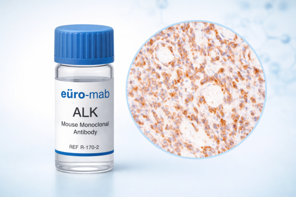 euro-mab ALK Mouse Monoclonal is a research-use antibody (RUO) designed for in vitro immunohistochemical detection on formalin-fixed, paraffin-embedded (FFPE) tissues. Available ready-to-use (0.1–5 mL) or concentrated (0.1–1 mL), it should be stored at 2–8°C and handled according to standard laboratory protocols.